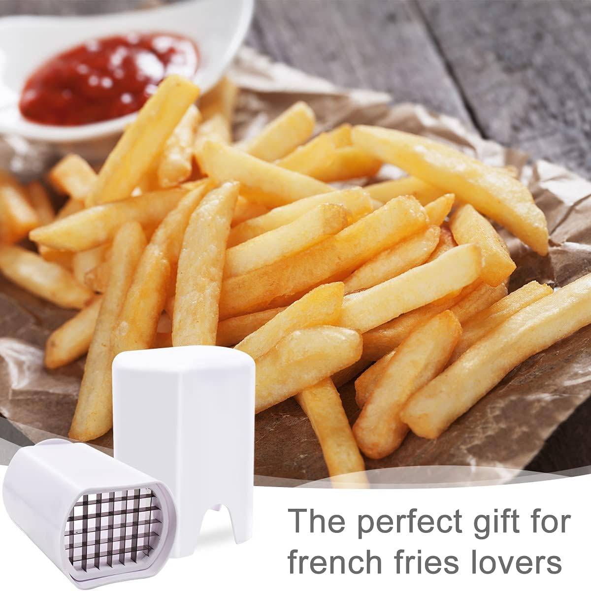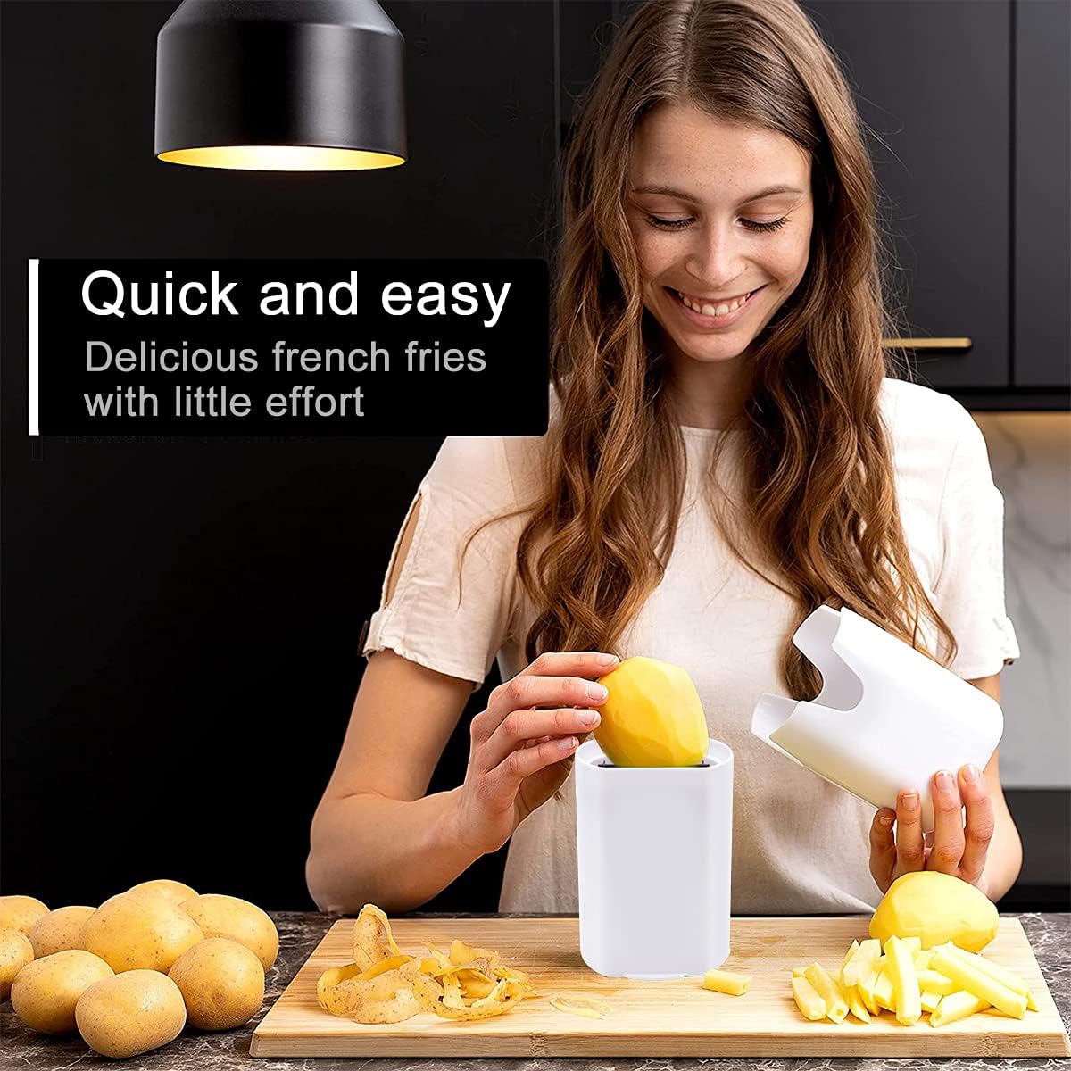 Deja de picar y cortar a mano con este cortador blanco para papas. Este utensilio de cocina, elaborado en plástico resistente y con una hoja de acero inoxidable, te permitirá obtener rebanadas perfectas con facilidad. Su diseño moderno y brillante no solo es atractivo, sino que también es fácil de limpiar. Aunque es ideal para papas, también puede ser utilizado con frutas.