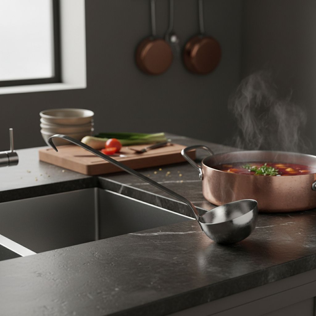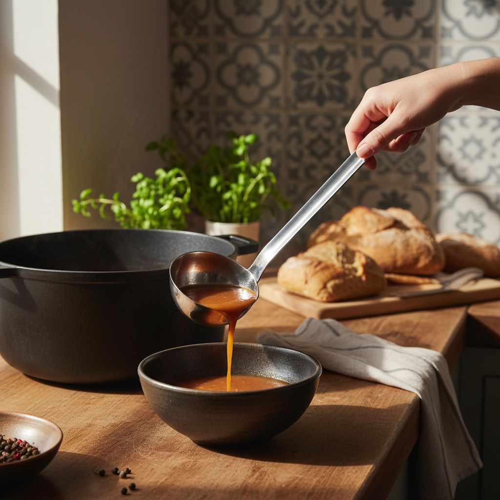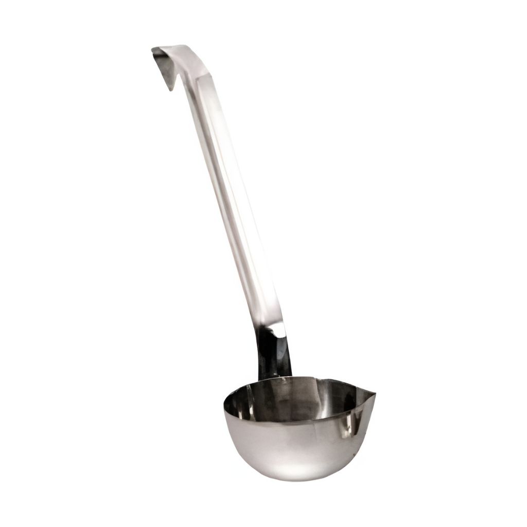 Cucharón gastronómico de acero inoxidable de 33 cm, ideal para chefs y amantes de la cocina. Su diseño robusto y elegante permite servir caldos, sopas y guisos con facilidad y precisión. Fabricado con materiales de alta calidad, garantiza durabilidad y resistencia al uso diario en la cocina.