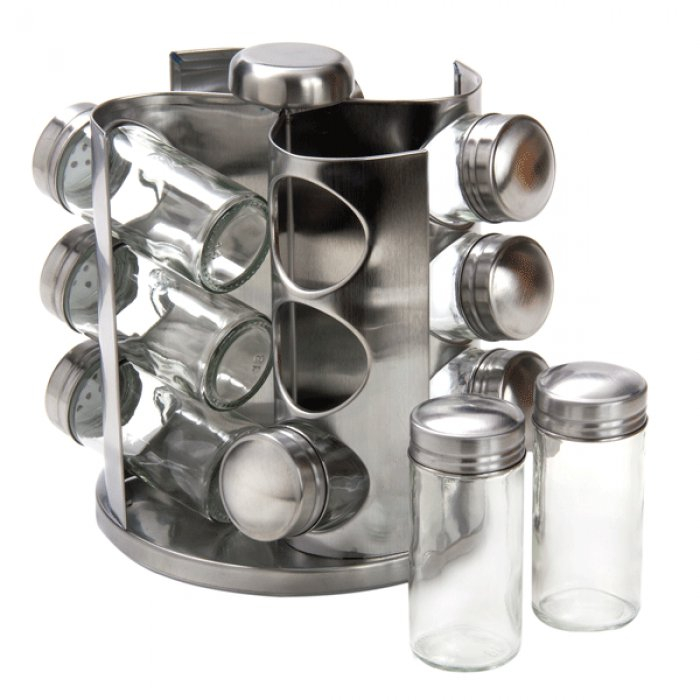 Incre?ble especiero giratorio realizado en acero inoxidable. Cuenta con 12 frascos de vidrios en lo que podr?s coleccionar tus especias favoritas. Ideal para mantener las especias en orden. Su elegante dise?o te aportar? estilo a tu espacio si lo deseas exponer y si no tiene la medida ideal para que entre en el armario de tu cocina. Disfrut? de cocinar y proba nuevos sabores con este hermoso y practico especiero giratorio.