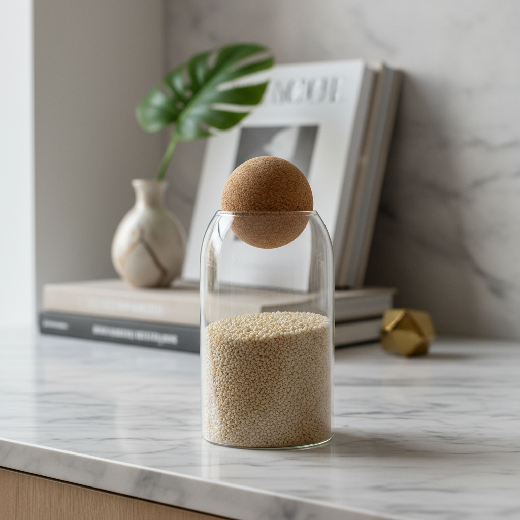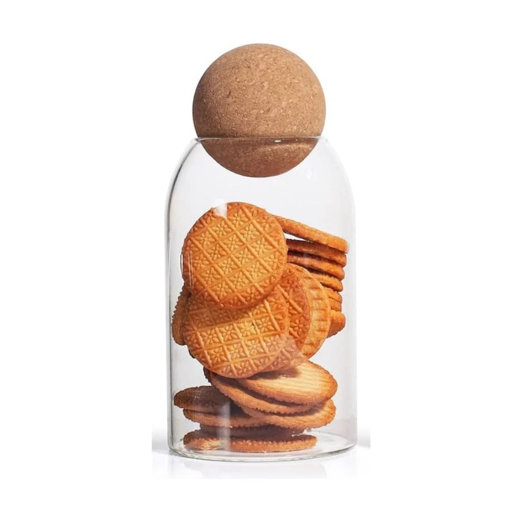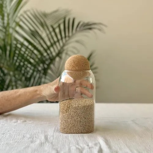 Este es un frasco de vidrio con tapa de corcho, ideal para almacenamiento y decoraci?n.