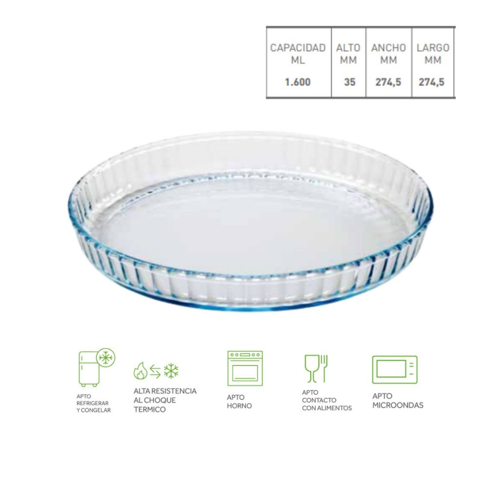 Fuente de vidrio borosilicato con alta resistencia al choque termico.