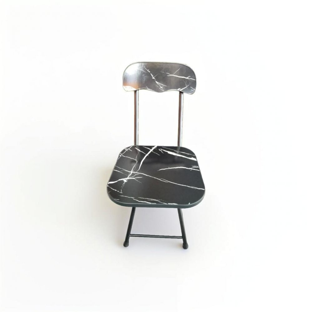 Silla plegable redonda con estructura de hierro y base de madera serigrafiada.