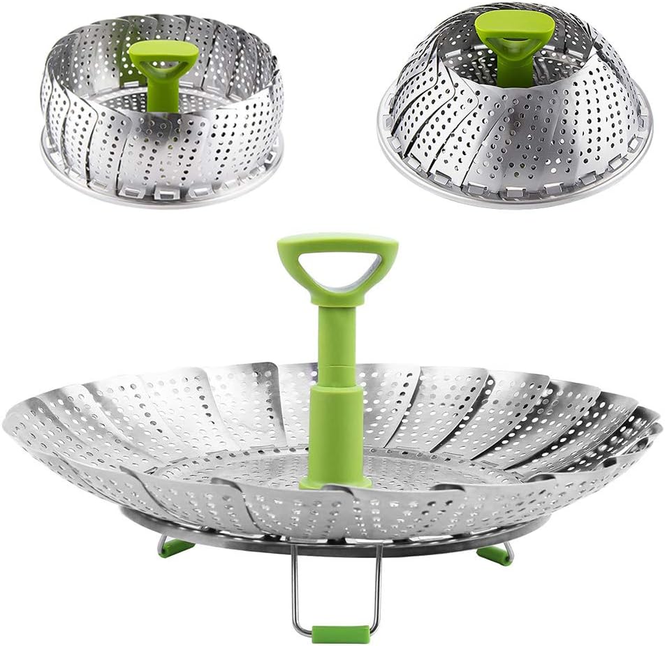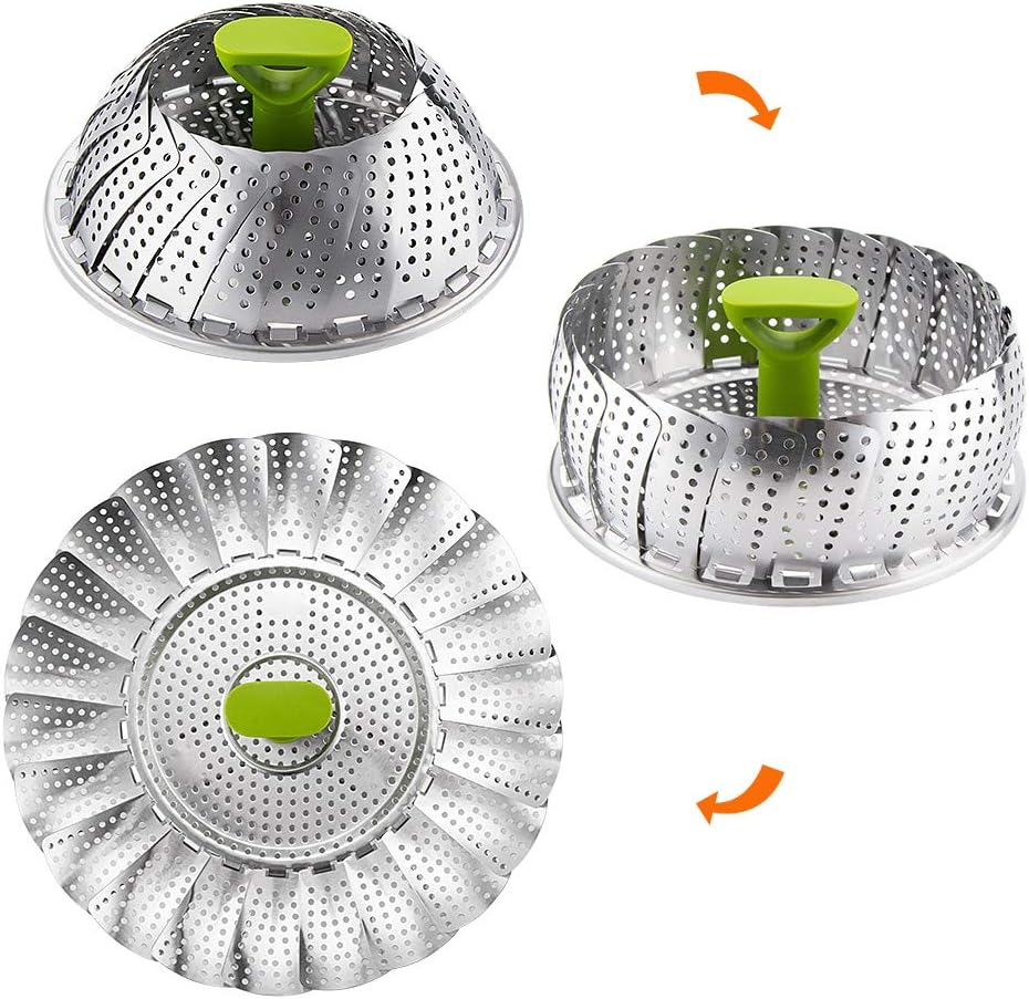 Ampliable y plegable: la cesta del vaporizador puede colapsarse para almacenarse y expandirse para adaptarse a varios tamaños de ollas / sartenes o ollas a presión, convirtiendo su olla favorita en un vaporizador seguro y efectivo. Se abre como un lirio de agua y se pliega de forma compacta para ahorrar espacio de almacenamiento.