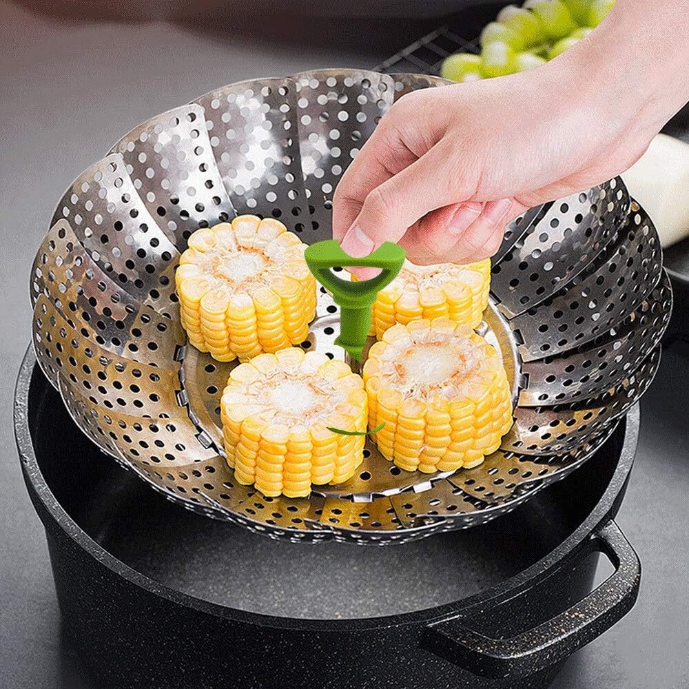 Diseño único: 3 patas plegables con silicona no rayarán su olla, también podrían mantener la comida por encima del agua hirviendo. La manija central protege sus manos del vapor caliente, ya que ayuda a insertar la cesta de acero inoxidable en las ollas profundas y la extracción segura del agua hirviendo.